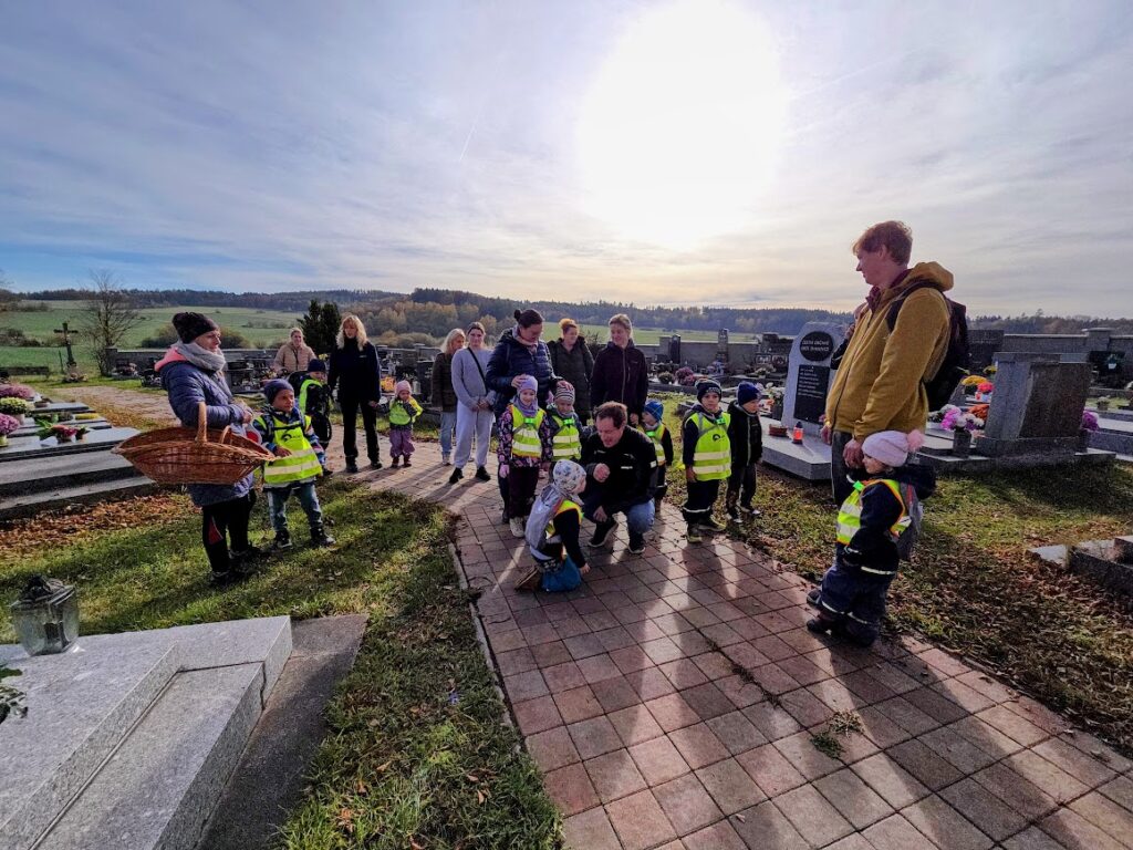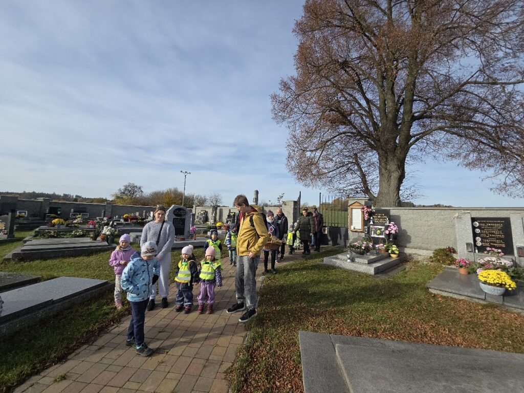 V posledním říjnovém dnu jsme společně navštívili místní hřbitov, abychom uctili svátek Dušičky, památku zesnulých. Myslíme s láskou na své předky v období společné vzpomínky na všechny zemřelé. Na místní hřbitov jsme přinesli malá světýlka, věříme, že život zemřelých nezhasl a žije stále v nás. Děti vyrobili lucerničky a věnečky, kterými společně s rodiči vyzdobili místa odpočinku svých předků.